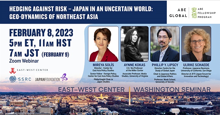 2023 Abe Fellows Global Forum, Hedging Against Risk – Japan in an Uncertain World: Geo-Dynamics of Northeast Asia, features Abe Fellows Mireya Solis, Brookings Institution; Aynne Kokas, University of Virginia; Phillip Lipscy, University of Toronto; Ulrike Schaede, University of California, San Diego, and moderated by Satu Limaye, East West Center, Washington, DC.