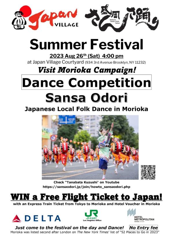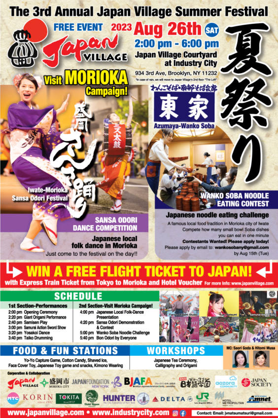 In addition, there will be special guests from Japan. It is the Morioka city Campaign Group of Iwate prefecture, the northside of Japan. Morioka city was listed as second after London on The New York Times’ list of 52 Places to Go in 2023, Morioka city will host a Visit Morioka Campaign! at the festival. The Morioka local folk-dance team will perform Morioka Sansa Odori. The Morioka city group will also introduce and demonstrate the traditional local food “Wanko Soba”. At the Natsumatsuri, there will be a “Wanko Soba eating contest”. If you are interested, please join the Wanko Soba eating contest.