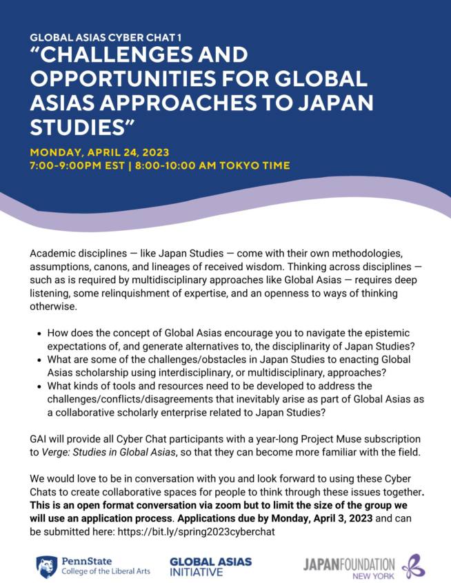 Part of a collaboration between JFNY and Global Asias Initiative (GAI) at The Pennsylvania State University, which will involve a Cyber Chats series Migration, Identity, and Diasporas at the Intersection of Japan Studies and Global Asias in spring 2023, a year-long early career networking project designed to cultivate substantial engagement between scholars in the US and Japan, participation in the Global Asias 7 conference (spring 2025), and eventually a publication in Verge: Studies in Global Asias.