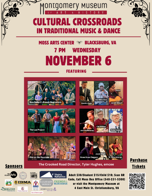 Fiddles, guitars, banjos, and clogging take center stage at the Montgomery Museum’s Cultural Crossroads in Traditional Music and Dance concert, featuring regional heritage artists representing old-time, bluegrass, and dance at the Moss Arts Center at Virginia Tech on Wednesday, November 6, at 7PM.