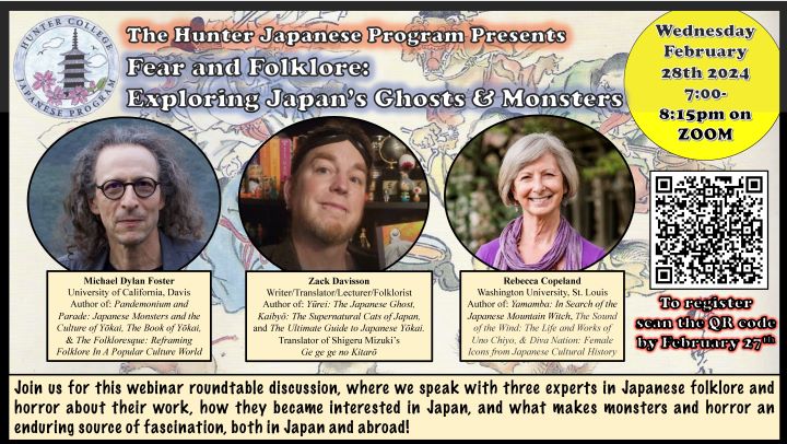 The Hunter Japanese Program presents Fear and Folklore: Exploring Japan’s Ghosts and Monsters. Join Hunter College for this webinar roundtable discussion where three experts in Japanese folklore and horror will talk about their work, how they became interested in Japan, and what makes monsters and horror and enduring source of fascination, both in Japan and abroad!