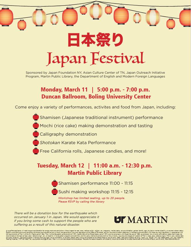 Sponsored by the Department of English Modern Foreign Languages, Japan Foundation NY, Asian Culture Center of TN, and the Japan Outreach Initiative Program. Come enjoy a variety of performances, activities, and food from Japan, including: