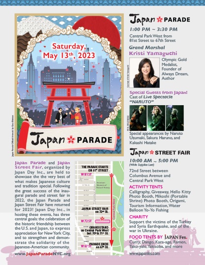 Japan Parade and Japan Street Fair, organized by Japan Day Inc., are held to showcase the the very best of what makes Japanese culture and tradition special. Following the great success of the inaugural parade and street fair in 2022, the Japan Parade and Japan Street Fair have returned for 2023! Japan Day Inc., in hosting these events, has three central goals: the celebration of the historic friendship between the U.S. and Japan, to express appreciation for New York City, and to strengthen and demonstrate the solidarity of the Japanese-American community.