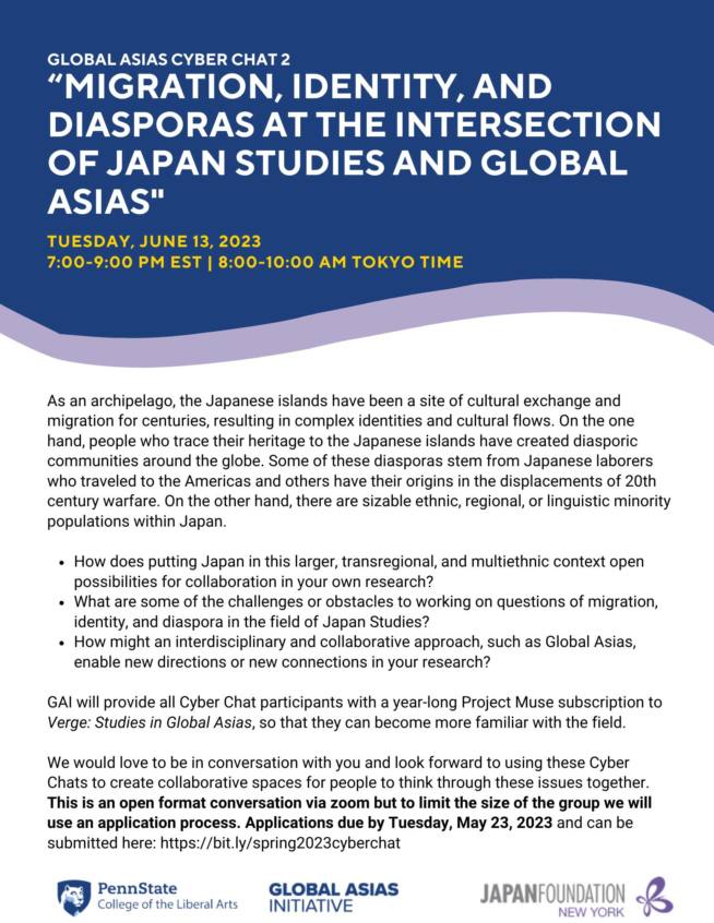Part of a collaboration between JFNY and Global Asias Initiative (GAI) at The Pennsylvania State University, which will involve a Cyber Chats series Challenges and Opportunities for Global Asias Approaches to Japan Studies in spring 2023, a year-long early career networking project designed to cultivate substantial engagement between scholars in the US and Japan, participation in the Global Asias 7 conference (spring 2025), and eventually a publication in Verge:Studies in Global Asias.