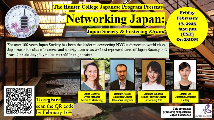 The Hunter College Japanese Program Presents Networking Japan: Japan Society & Fostering Kizuna. This is part of the Networking Japan: Career Development Series. For over 100 years Japan Society has been the leader in connecting NYC audiences to world class Japanese arts, culture, business and society. Join Hunter College and representatives of Japan Society to learn the role they play in this incredible organization: Anna Cabasso, Event Manager of Media & Marketing, Timothy Nassau, Education Officer of Education Program, Amanda Waddell, Senior Program Officer of Performing Arts and Stefani Oh, Curatorial Assistant at the Gallery.
