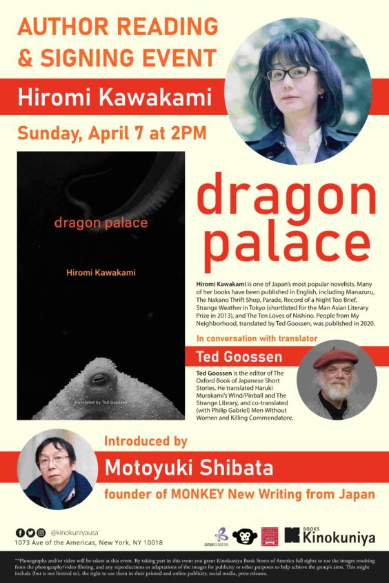 In special collaboration with Stone Bridge Press and MONKEY New Writing from Japan, Hiromi Kawakami, one of Japan’s most popular novelists and the winner of Japanese literary awards such as Akutagawa Prize, the Tanizaki Prize, and more, gives a talk about her latest novel Dragon Palace with translator Ted Goossen. Signing event is to follow the talk.